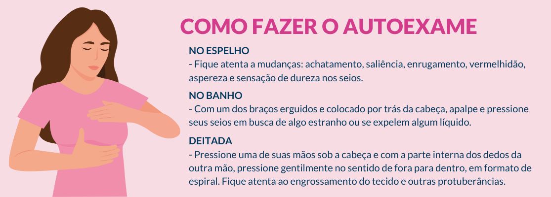 Todas as mulheres, em qualquer idade, devem estar familiarizadas com o seu próprio corpo para saber o que é e o que não é normal em suas mamas. A maioria dos diagnósticos de câncer de mama é feita pelas próprias mulheres ao notar alterações. Por isso, a importância do autoexame. Observe, toque e sinta suas mamas regularmente, para reconhecer nuances naturais e identificar alterações suspeitas.